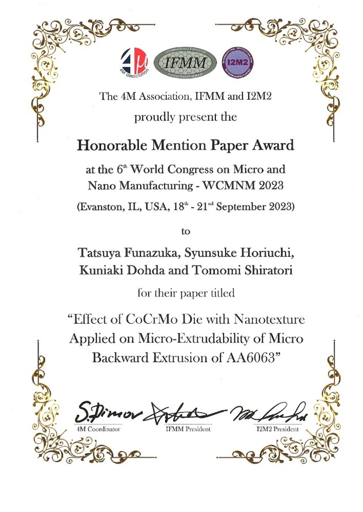 国際会議6th World Congress on Micro and Nano Manufacturing WCMNM20232023918()21()Evanston, Illinois, USA)において、学術研究部工学系 船塚達也助教がHonorable Mention Paper Awardを受賞しました。